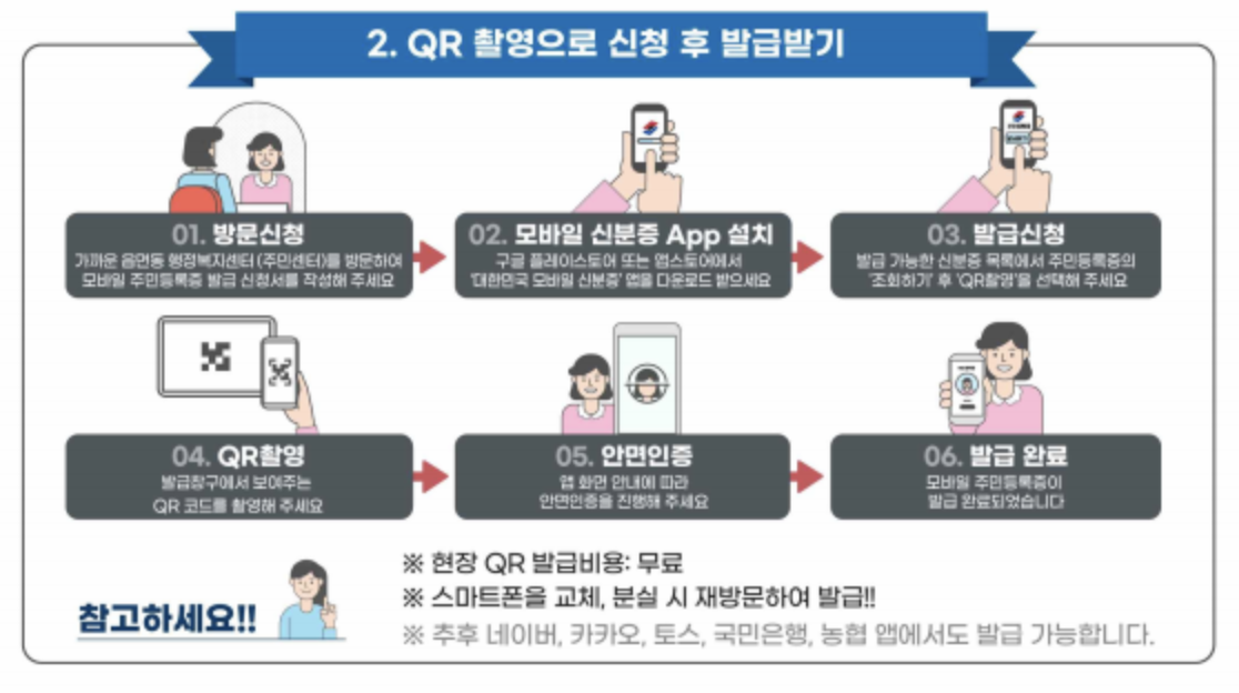 QR코드 발급 방식은 모바일 앱 설치하고 주민센터 방문하셔서 QR코드 촬영과 안면 인증을 하면 바로 발급되는 방식입니다.